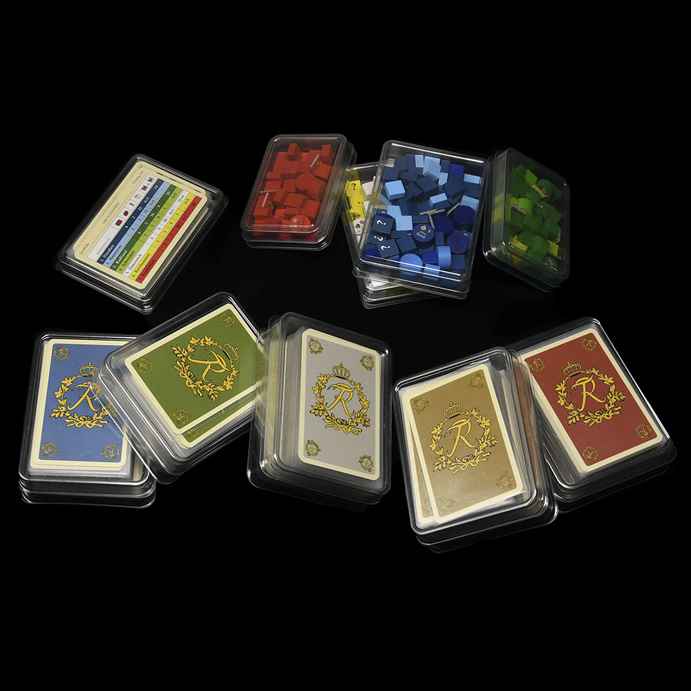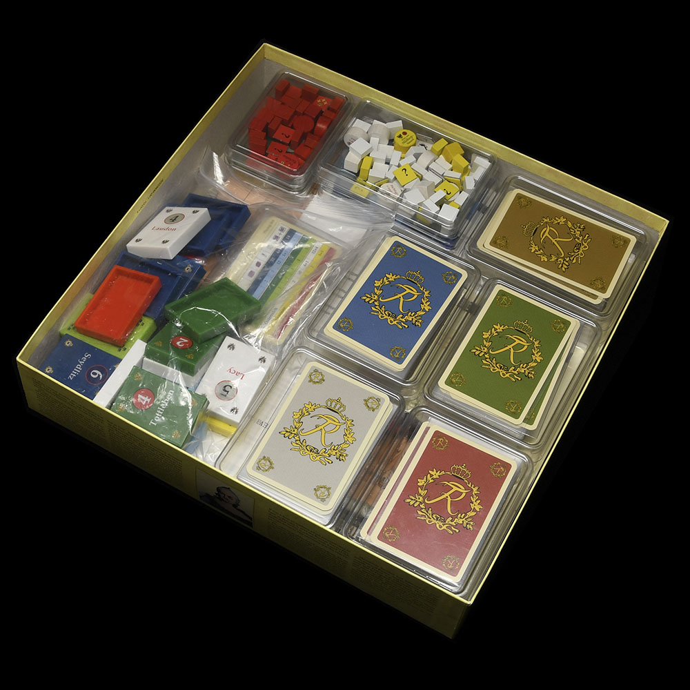 We were lucky to receive both games from a good friend — already sleeved and perfectly sorted. Thanks to this, each deck has its own dedicated card holder, and each player has a separate tray for all wooden tokens and counters. Everything fits perfectly inside the original game box.
