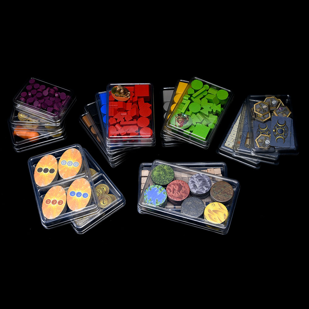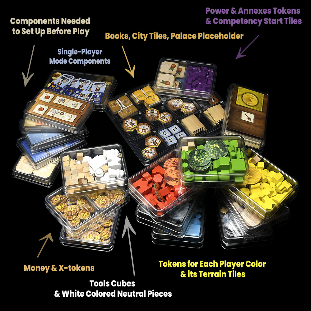 Each set has been carefully designed to fit its game box perfectly, providing dedicated holders for player pieces, resources, and tokens. Separate holders keep setup components easily accessible — so you can start playing faster and keep everything neatly organized.