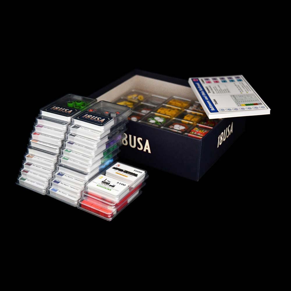 This is set of 3 trays to sort all track tiles. This set is dedicated to new edition of 18USA. This way your game will be ready to play anytime! Forget the tedious sorting of tracks before the game and figuring out where to put them. You can keep them in a tray and pass them from hand to hand when needed.
