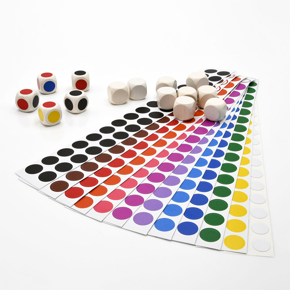 White, standard blank dice with the option to apply colored blob stickers.