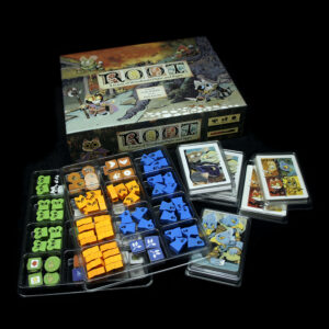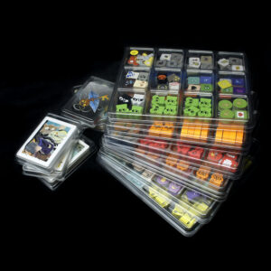 * – we have tested our solution with standard 50 mic sleeves and premium sleeves of 70 – 80 mic thickness, and it worked very well with both. However, please note that thicker sleeves add extra bulk to the cards, and since there are many of them in the game, it may not be possible to fit everything into our tray set if you are using very thick sleeves (90 microns or more).