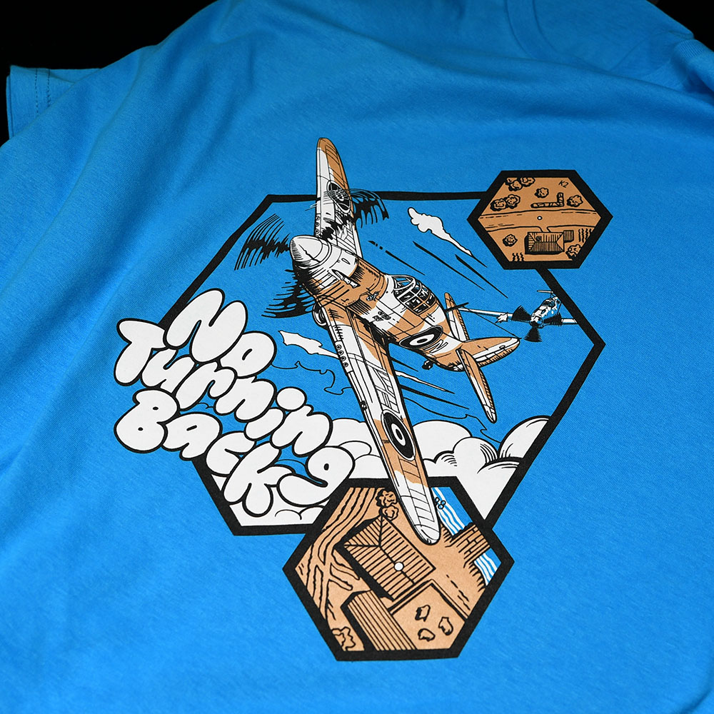 Jarek is renowned for his meticulous attention to detail and historical accuracy. For the image on our t-shirt, Jarek chose to depict a Hawker Hurricane being pursued by a Messerschmitt Bf 109.