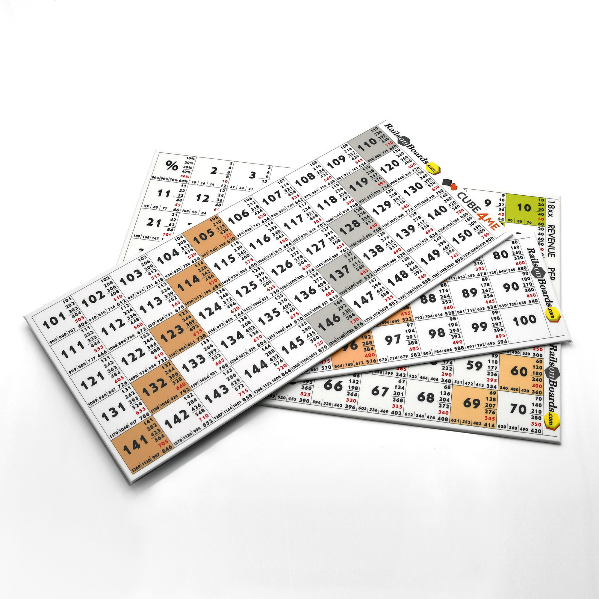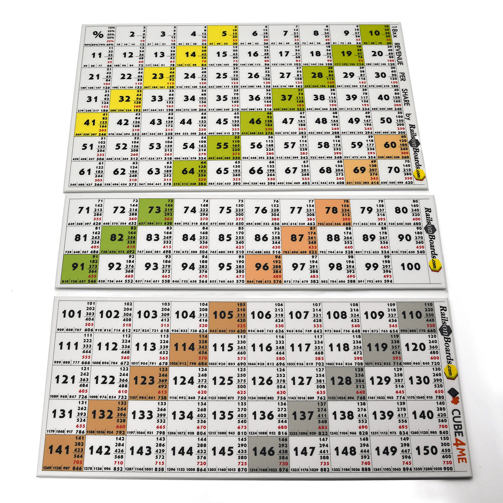 Our hand-made mounted on 2mm cardboard two game boards for determining income during any 18xx game: a large figure shows the value of income per share, there is indicated the amount of dividend for individual amounts of shares next to it, from 10% to 90%.